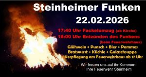 Funkenfeuer 17:00 22.02.2026 Ab 17:00 Uhr Verpflegung am Feuerwehrhaus 17:40 Uhr: Fackelumzug (ab Kirche) 18:00 Uhr Entzünden des Funkens (am Feuerwehrhaus) FeuerwehrhausSchulstraße 5Memmingen, Bayern 87700DeutschlandVeranstaltungsort anschauenKarte Feuerwehrhaus iCal Google Weiterlesen Kompletten Kalender ansehen